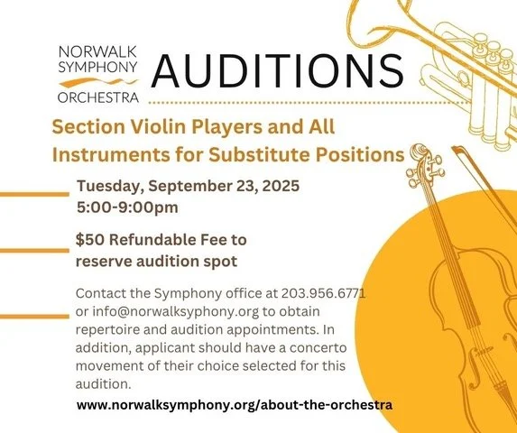 Auditions for the Norwalk Symphony will be held at Norwalk Concert Hall from 5:00-9:00pm on the evening of September 23, 2025. Specific section violin player(s) are needed, and all instruments are welcome to apply for substitute positions. Applications (including the fee) will be accepted until September 16, 2025. Applicants will pay a $50 fee in advance to hold their audition spot; this fee will be refunded upon attendance. Checks should be made to: Norwalk Symphony Orchestra. Please email the office or call us at 203.956.6771 for the required repertoire for your instrument and to schedule a time slot for your audition. In addition to the required pieces, applicant should have a concerto movement of their choice selected for this audition.